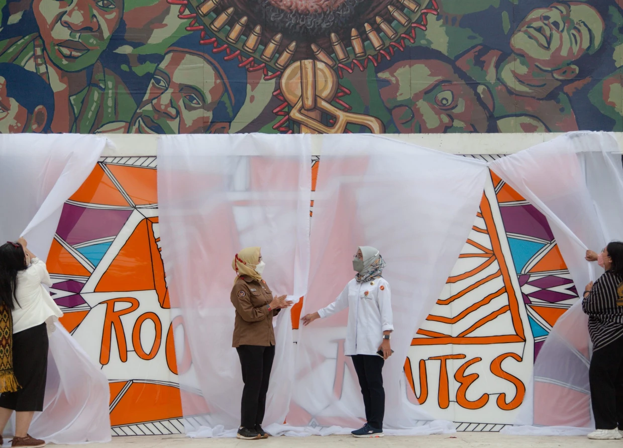 The main exhibition of Biennale Yogyakarta 2021 is entitled Roots <> Routes which raises issues about the relationship between Indonesia as an archipelago, and Oceania/Pacific region. Through a long history from migration routes, traces of language and cultural assimilation, religious missions, or colonialism, but also through its association to contemporary socio-political situations. There, the art installations were creatively designed with numerous media and instruments. Most of them utilize technology like spotlights, holograms, audio, laser, and video. Though traditional art instruments like paints, leather, cloth, photographs, papers, and canvas are still apparent